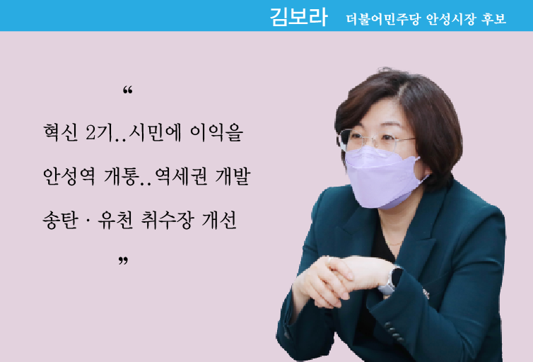 "중단없는 안성발전을 해내겠다" 김보라 민주당 안성시장 후보의 출마일성이다. 지난 안성시장 보궐선거에서 당선되면서 지역 최초의 여성 안성시장이 된 김보라 후보는 지난 2년은 '혁신'이며 앞으로의 4년은 '혁신 2기'라고 강조했다. 김 후보에게 안성의 현안에 대해 들어본다. (편집자주)