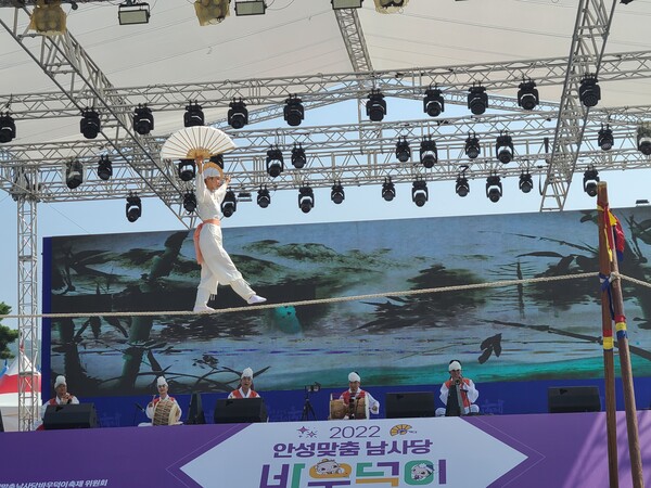 2022 안성맞춤 남사당 바우덕이 축제 첫째날인 9월30일 오전 11시에 축제의 시작을 알리는 개장식을 개최하고 4일간의 일정에 들어갔다. 개장식 후 펼쳐진 줄타기 공연. (사진=안성시)