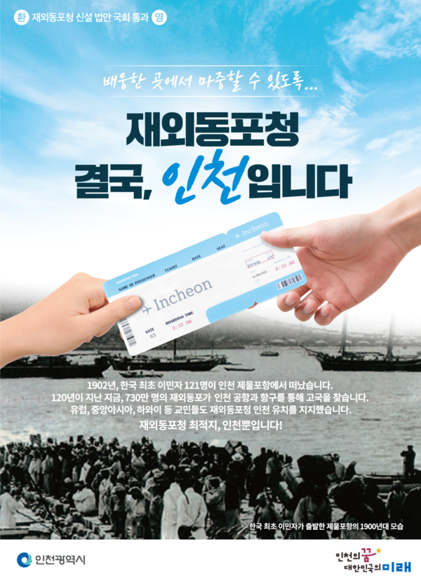 [일간경기=안종삼 기자] 인천시가 재외동포청 신설 법안의 국회 통과를 환영하며 인천 유치에 주력하겠다고 밝혔다.