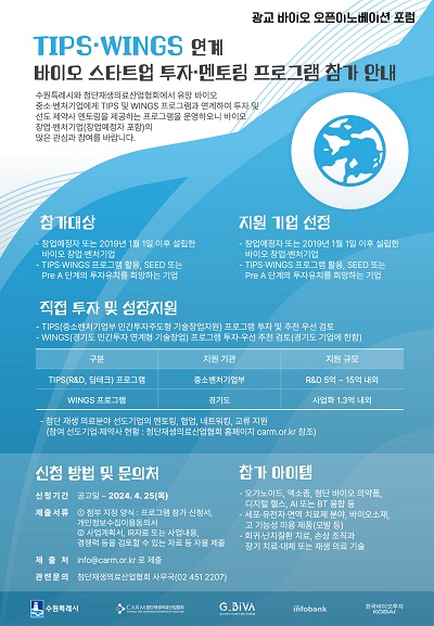수원시 관계자는 “수원시가 창업하기 좋은 첨단과학연구 도시로 발돋움하고, 바이오 기업의 창업과 성장을 위한 금융 생태계를 조성하는데 이번 투자 프로그램이 초석이 될 것”이라며 “특히 광교 인근의 성장 잠재력이 높은 바이오 기업들이 많이 신청해 주길 바란다”고 말했다.