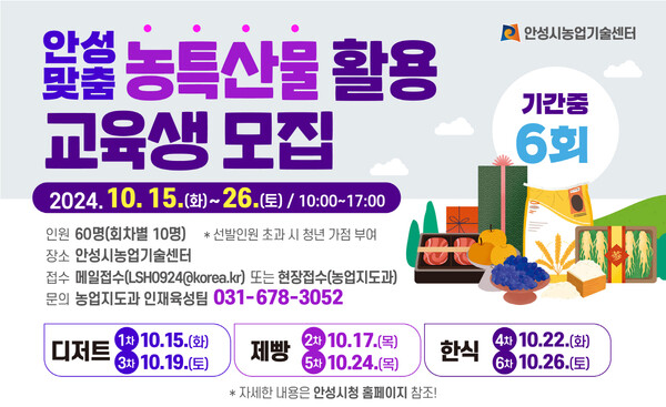 [일간경기=이국진 기자] 안성시농업기술센터는 오는 9월30일부터 10월4일까지 안성시 관내 제철 농특산물을 활용한 디저트, 한식, 제빵 교육을 실시한다고 밝혔다.