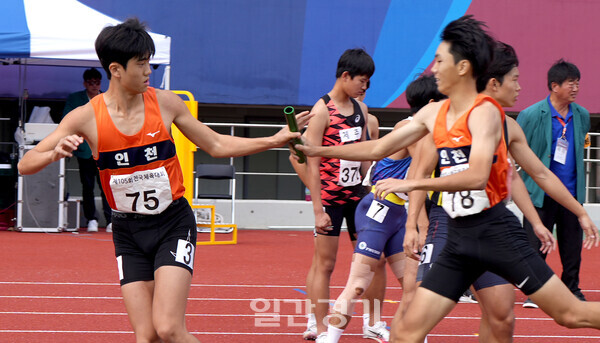 [일간경기=한동헌 기자] 경남 김해종합운동장에서 10월16일 열린 '제105회 전국체육대회' 육상 트랙 남고부 4X400릴레이 예선에 출전한 인천의 계준혁(인천체고) 선수가 오예준(인천체고) 선수에게 바통을 넘기고 있다. 인천은 이날 벌어진 결승경기에서 3분15초31로 경기도에 0.49초 앞서며 결승선을 통과 금메달을 목에 걸었다.