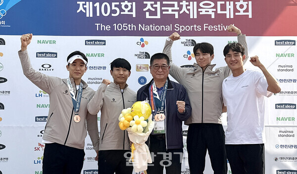 [일간경기=한동헌 기자] 사상 최초로 전국체전 근대5종 단체 4종에서 3연패를 달성한 인천시체육회팀이 16일 4종 계주 결승에서 동메달을 따낸 후 메달 세레머니를 하고 있다. 이날 인천은 1152점을 획득, 광주시(1158점)와 대전시(1153점)에 이어 동메달 시상대에 올랐다.