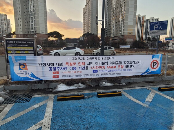 [일간경기=이국진 기자] 안성시는 폭설로 인한 특별재난지역 선포에 따라 시민들의 경제적 부담을 덜고 지역사회의 빠른 회복을 지원하기 위해 지역 공영주차장 7개소를 최초 1시간 무료로 이용할 수 있도록 운영한다고 12월23일 밝혔다.