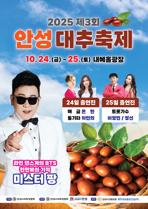 [일간경기=이국진 기자] 안성시대추연합회가 주최하는 2025년 제3회 안성대추 직거래장터가 24일과 25일 이틀간 내혜홀광장에서 열린다. 안성시대추연합회와 안성시가 공동 주관하는 이번 행사에는 약 25개의 판매부스가 설치된다. 대추가요제 등 다채로운 공연도 함께 진행된다.