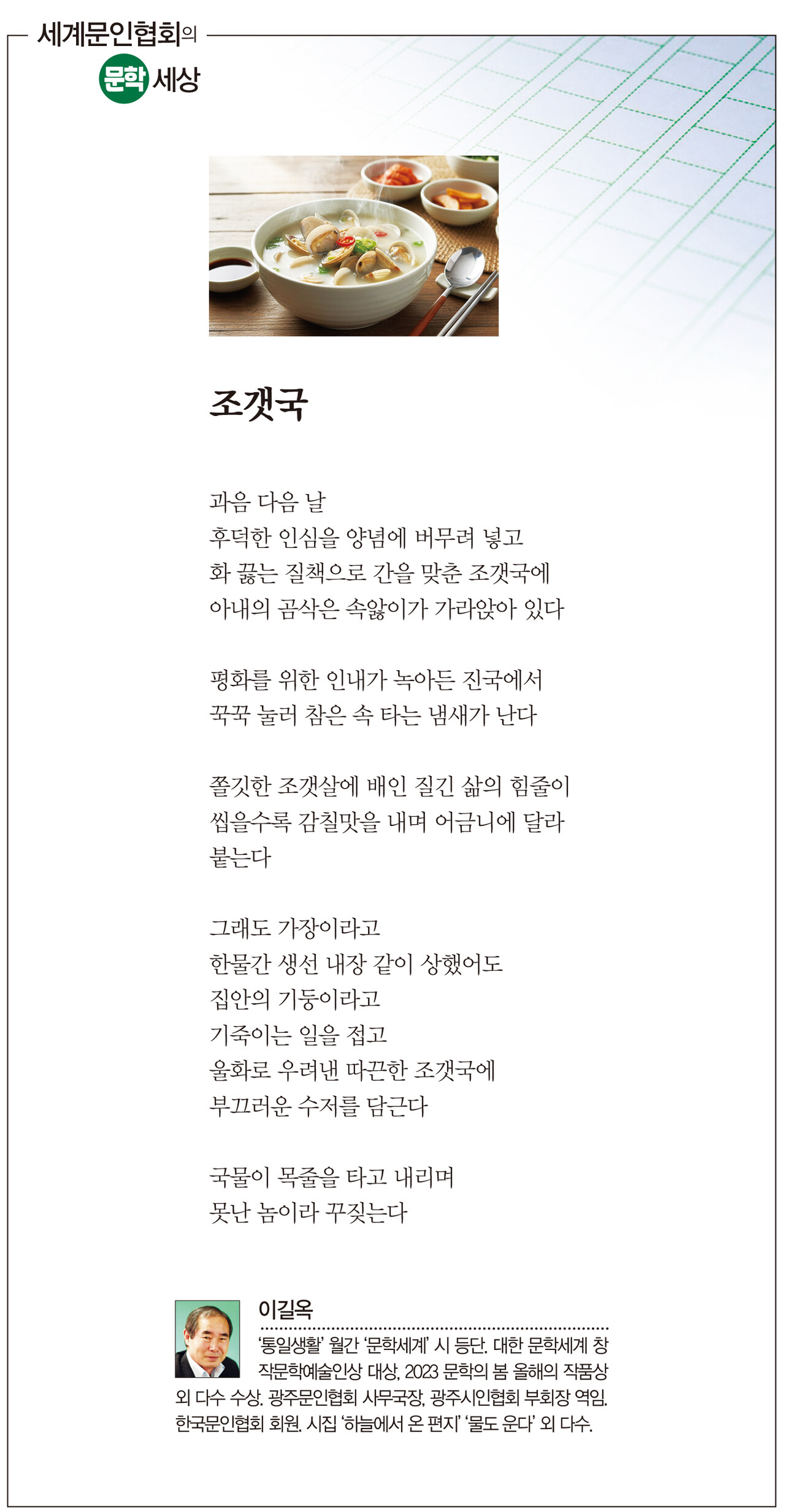 키워드 #조갯국 #이길옥 #세계문인협회 일간경기 ilgangg@naver.com 다른기사 보기 저작권자 © 일간경기 무단전재 및 재배포 금지 당신만 안 본 뉴스 "인구 154만 메가시티" 화성시, 4대권역 중심 '새판' 이천시, 신둔·마장에 수요응답형 똑버스 운행 포천시, 전국 첫 소규모 공장 '기숙사 족쇄' 풀었다 평택시, 2040년 인구 100만 미래도시 경관계획 수립 안성시, 무상교통 지원 누적 이용률 524만건 돌파 안비관어 雁飞觀魚 "350억 부실 채권에 수상한 땅 거래"‥ 안성농협 비대위, 경영진 비판 "인구 154만 메가시티" 화성시, 4대권역 중심 '새판' 개의 댓글 회원로그인 작성자 비밀번호 댓글 내용입력 댓글 정렬 최신순 추천순 답글순 BEST댓글 BEST 댓글 답글과 추천수를 합산하여 자동으로 노출됩니다. 닫기 더보기 댓글삭제 삭제한 댓글은 다시 복구할 수 없습니다. 그래도 삭제하시겠습니까? 비밀번호 닫기 댓글수정 댓글 수정은 작성 후 1분내에만 가능합니다. 본문 / 400 비밀번호 닫기 내 댓글 모음 닫기 주요기사 "인구 154만 메가시티" 화성시, 4대권역 중심 '새판' 경기도 소통없는 예산편성‥ 도의회·단체들 ‘집단 반발’ 경기도 “취약계층 복지예산 복원 최우선” 유정복 시장, 국무총리 만나 수도권매립지 종료 조속한 이행 요구 김동연 “경기도·파주·LG는 리쇼어링 원팀” 간척지가 축산테마파크로..국내 최대 화성 '에코팜랜드' 25일 개장