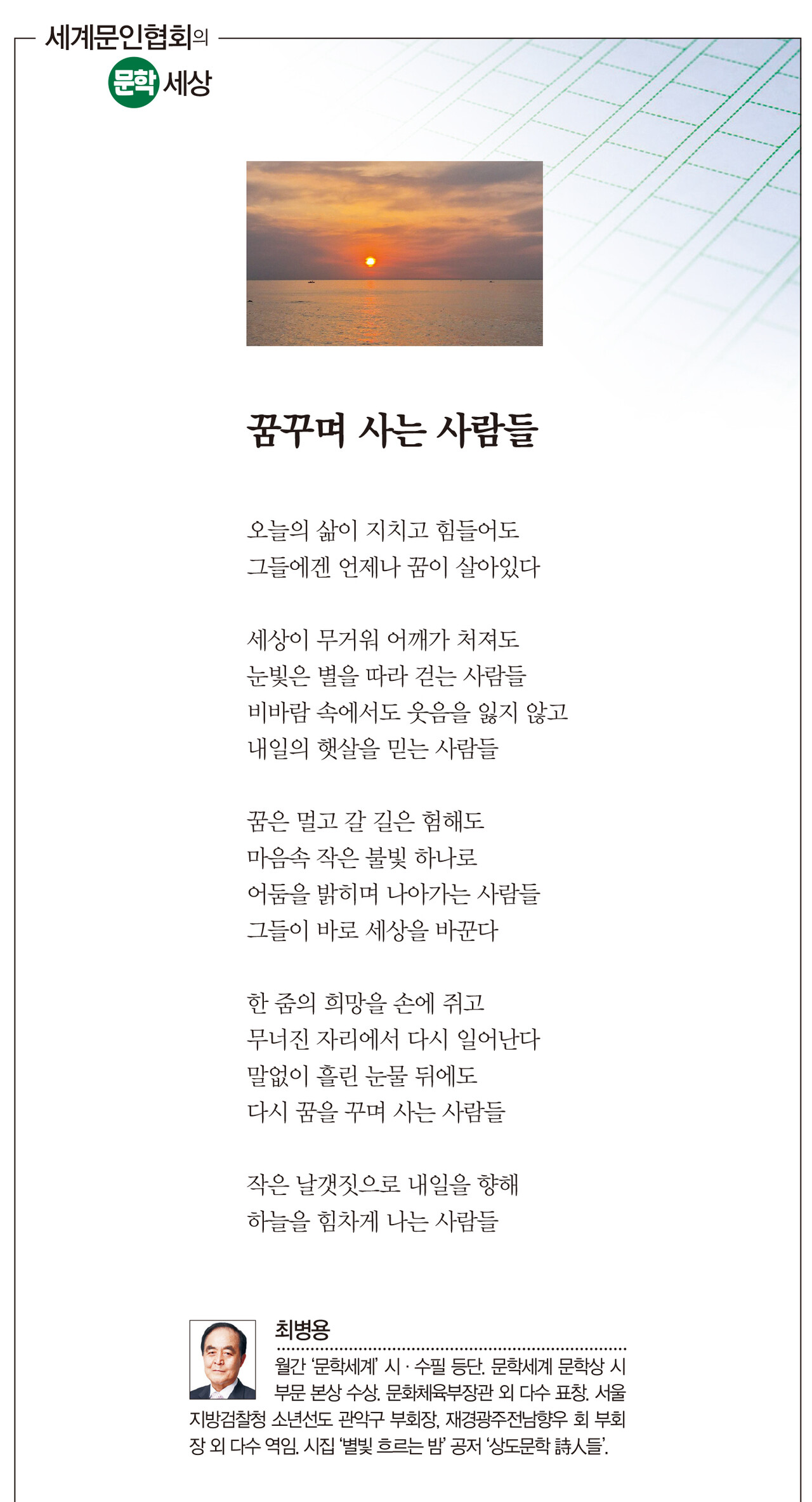 키워드 #최병용 #꿈꾸며사는사람들 #세계문인협회 일간경기 ilgangg@naver.com 다른기사 보기 저작권자 © 일간경기 무단전재 및 재배포 금지 당신만 안 본 뉴스 "인구 154만 메가시티" 화성시, 4대권역 중심 '새판' 이천시, 신둔·마장에 수요응답형 똑버스 운행 포천시, 전국 첫 소규모 공장 '기숙사 족쇄' 풀었다 평택시, 2040년 인구 100만 미래도시 경관계획 수립 안성시, 무상교통 지원 누적 이용률 524만건 돌파 안비관어 雁飞觀魚 "350억 부실 채권에 수상한 땅 거래"‥ 안성농협 비대위, 경영진 비판 "인구 154만 메가시티" 화성시, 4대권역 중심 '새판' 개의 댓글 회원로그인 작성자 비밀번호 댓글 내용입력 댓글 정렬 최신순 추천순 답글순 BEST댓글 BEST 댓글 답글과 추천수를 합산하여 자동으로 노출됩니다. 닫기 더보기 댓글삭제 삭제한 댓글은 다시 복구할 수 없습니다. 그래도 삭제하시겠습니까? 비밀번호 닫기 댓글수정 댓글 수정은 작성 후 1분내에만 가능합니다. 본문 / 400 비밀번호 닫기 내 댓글 모음 닫기 주요기사 "인구 154만 메가시티" 화성시, 4대권역 중심 '새판' 경기도 소통없는 예산편성‥ 도의회·단체들 ‘집단 반발’ 경기도 “취약계층 복지예산 복원 최우선” 유정복 시장, 국무총리 만나 수도권매립지 종료 조속한 이행 요구 김동연 “경기도·파주·LG는 리쇼어링 원팀” 간척지가 축산테마파크로..국내 최대 화성 '에코팜랜드' 25일 개장