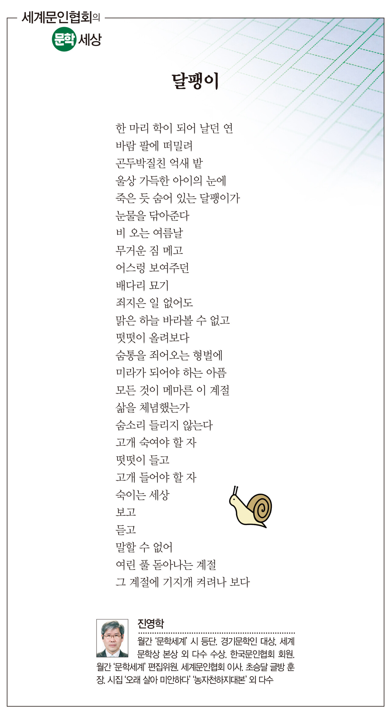키워드 #달팽이 #세계문인협회 #진영학 일간경기 ilgangg@naver.com 다른기사 보기 저작권자 © 일간경기 무단전재 및 재배포 금지 당신만 안 본 뉴스 "인구 154만 메가시티" 화성시, 4대권역 중심 '새판' 이천시, 신둔·마장에 수요응답형 똑버스 운행 포천시, 전국 첫 소규모 공장 '기숙사 족쇄' 풀었다 평택시, 2040년 인구 100만 미래도시 경관계획 수립 안성시, 무상교통 지원 누적 이용률 524만건 돌파 안비관어 雁飞觀魚 "350억 부실 채권에 수상한 땅 거래"‥ 안성농협 비대위, 경영진 비판 "인구 154만 메가시티" 화성시, 4대권역 중심 '새판' 개의 댓글 회원로그인 작성자 비밀번호 댓글 내용입력 댓글 정렬 최신순 추천순 답글순 BEST댓글 BEST 댓글 답글과 추천수를 합산하여 자동으로 노출됩니다. 닫기 더보기 댓글삭제 삭제한 댓글은 다시 복구할 수 없습니다. 그래도 삭제하시겠습니까? 비밀번호 닫기 댓글수정 댓글 수정은 작성 후 1분내에만 가능합니다. 본문 / 400 비밀번호 닫기 내 댓글 모음 닫기 주요기사 "인구 154만 메가시티" 화성시, 4대권역 중심 '새판' 경기도 소통없는 예산편성‥ 도의회·단체들 ‘집단 반발’ 경기도 “취약계층 복지예산 복원 최우선” 유정복 시장, 국무총리 만나 수도권매립지 종료 조속한 이행 요구 김동연 “경기도·파주·LG는 리쇼어링 원팀” 간척지가 축산테마파크로..국내 최대 화성 '에코팜랜드' 25일 개장