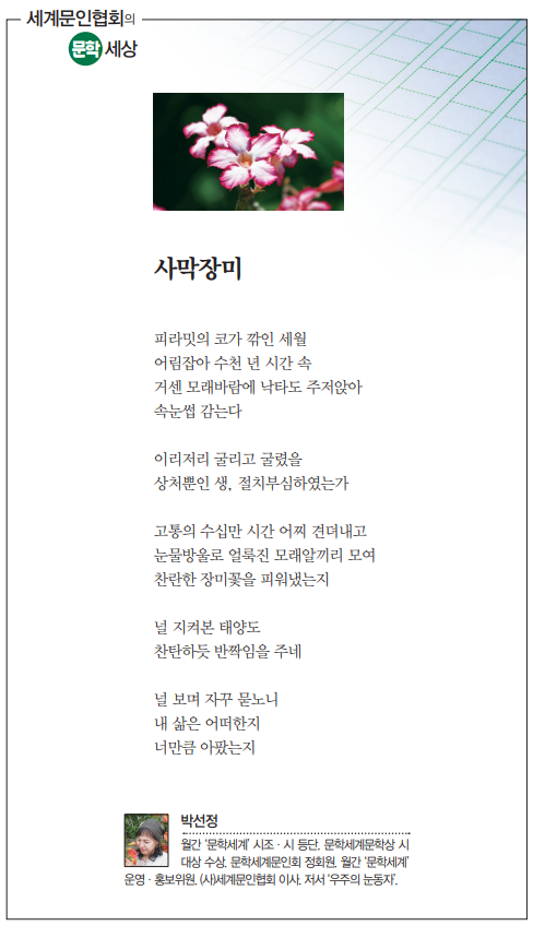 키워드 #박선정 #사막장미 #세게문인협회 일간경기 ilgangg@naver.com 다른기사 보기 저작권자 © 일간경기 무단전재 및 재배포 금지 당신만 안 본 뉴스 "인구 154만 메가시티" 화성시, 4대권역 중심 '새판' 이천시, 신둔·마장에 수요응답형 똑버스 운행 포천시, 전국 첫 소규모 공장 '기숙사 족쇄' 풀었다 평택시, 2040년 인구 100만 미래도시 경관계획 수립 안성시, 무상교통 지원 누적 이용률 524만건 돌파 안비관어 雁飞觀魚 "350억 부실 채권에 수상한 땅 거래"‥ 안성농협 비대위, 경영진 비판 "인구 154만 메가시티" 화성시, 4대권역 중심 '새판' 개의 댓글 회원로그인 작성자 비밀번호 댓글 내용입력 댓글 정렬 최신순 추천순 답글순 BEST댓글 BEST 댓글 답글과 추천수를 합산하여 자동으로 노출됩니다. 닫기 더보기 댓글삭제 삭제한 댓글은 다시 복구할 수 없습니다. 그래도 삭제하시겠습니까? 비밀번호 닫기 댓글수정 댓글 수정은 작성 후 1분내에만 가능합니다. 본문 / 400 비밀번호 닫기 내 댓글 모음 닫기 주요기사 "인구 154만 메가시티" 화성시, 4대권역 중심 '새판' 경기도 소통없는 예산편성‥ 도의회·단체들 ‘집단 반발’ 경기도 “취약계층 복지예산 복원 최우선” 유정복 시장, 국무총리 만나 수도권매립지 종료 조속한 이행 요구 김동연 “경기도·파주·LG는 리쇼어링 원팀” 간척지가 축산테마파크로..국내 최대 화성 '에코팜랜드' 25일 개장