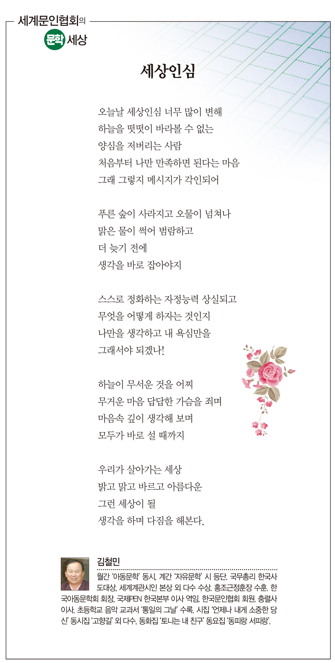 키워드 #세상인심 #김철민 #세계문인협회 일간경기 ilgangg@naver.com 다른기사 보기 저작권자 © 일간경기 무단전재 및 재배포 금지 당신만 안 본 뉴스 "인구 154만 메가시티" 화성시, 4대권역 중심 '새판' 이천시, 신둔·마장에 수요응답형 똑버스 운행 포천시, 전국 첫 소규모 공장 '기숙사 족쇄' 풀었다 평택시, 2040년 인구 100만 미래도시 경관계획 수립 안성시, 무상교통 지원 누적 이용률 524만건 돌파 안비관어 雁飞觀魚 "350억 부실 채권에 수상한 땅 거래"‥ 안성농협 비대위, 경영진 비판 "인구 154만 메가시티" 화성시, 4대권역 중심 '새판' 개의 댓글 회원로그인 작성자 비밀번호 댓글 내용입력 댓글 정렬 최신순 추천순 답글순 BEST댓글 BEST 댓글 답글과 추천수를 합산하여 자동으로 노출됩니다. 닫기 더보기 댓글삭제 삭제한 댓글은 다시 복구할 수 없습니다. 그래도 삭제하시겠습니까? 비밀번호 닫기 댓글수정 댓글 수정은 작성 후 1분내에만 가능합니다. 본문 / 400 비밀번호 닫기 내 댓글 모음 닫기 주요기사 "인구 154만 메가시티" 화성시, 4대권역 중심 '새판' 경기도 소통없는 예산편성‥ 도의회·단체들 ‘집단 반발’ 경기도 “취약계층 복지예산 복원 최우선” 유정복 시장, 국무총리 만나 수도권매립지 종료 조속한 이행 요구 김동연 “경기도·파주·LG는 리쇼어링 원팀” 간척지가 축산테마파크로..국내 최대 화성 '에코팜랜드' 25일 개장