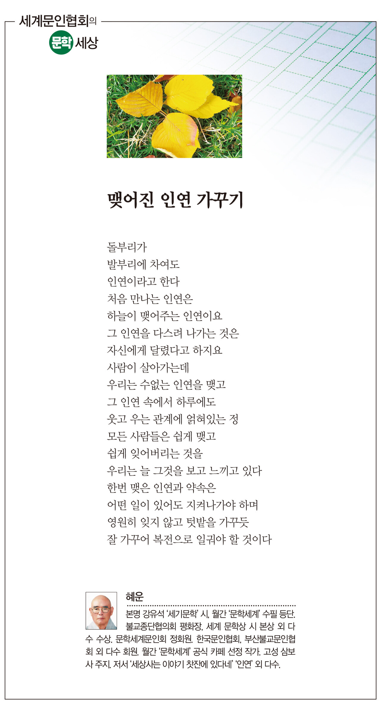 키워드 #혜운 #맺어진인연가꾸기 #세계문인협회 일간경기 ilgangg@naver.com 다른기사 보기 저작권자 © 일간경기 무단전재 및 재배포 금지 당신만 안 본 뉴스 "인구 154만 메가시티" 화성시, 4대권역 중심 '새판' 이천시, 신둔·마장에 수요응답형 똑버스 운행 포천시, 전국 첫 소규모 공장 '기숙사 족쇄' 풀었다 평택시, 2040년 인구 100만 미래도시 경관계획 수립 안성시, 무상교통 지원 누적 이용률 524만건 돌파 안비관어 雁飞觀魚 "350억 부실 채권에 수상한 땅 거래"‥ 안성농협 비대위, 경영진 비판 "인구 154만 메가시티" 화성시, 4대권역 중심 '새판' 개의 댓글 회원로그인 작성자 비밀번호 댓글 내용입력 댓글 정렬 최신순 추천순 답글순 BEST댓글 BEST 댓글 답글과 추천수를 합산하여 자동으로 노출됩니다. 닫기 더보기 댓글삭제 삭제한 댓글은 다시 복구할 수 없습니다. 그래도 삭제하시겠습니까? 비밀번호 닫기 댓글수정 댓글 수정은 작성 후 1분내에만 가능합니다. 본문 / 400 비밀번호 닫기 내 댓글 모음 닫기 주요기사 "인구 154만 메가시티" 화성시, 4대권역 중심 '새판' 경기도 소통없는 예산편성‥ 도의회·단체들 ‘집단 반발’ 경기도 “취약계층 복지예산 복원 최우선” 유정복 시장, 국무총리 만나 수도권매립지 종료 조속한 이행 요구 김동연 “경기도·파주·LG는 리쇼어링 원팀” 간척지가 축산테마파크로..국내 최대 화성 '에코팜랜드' 25일 개장